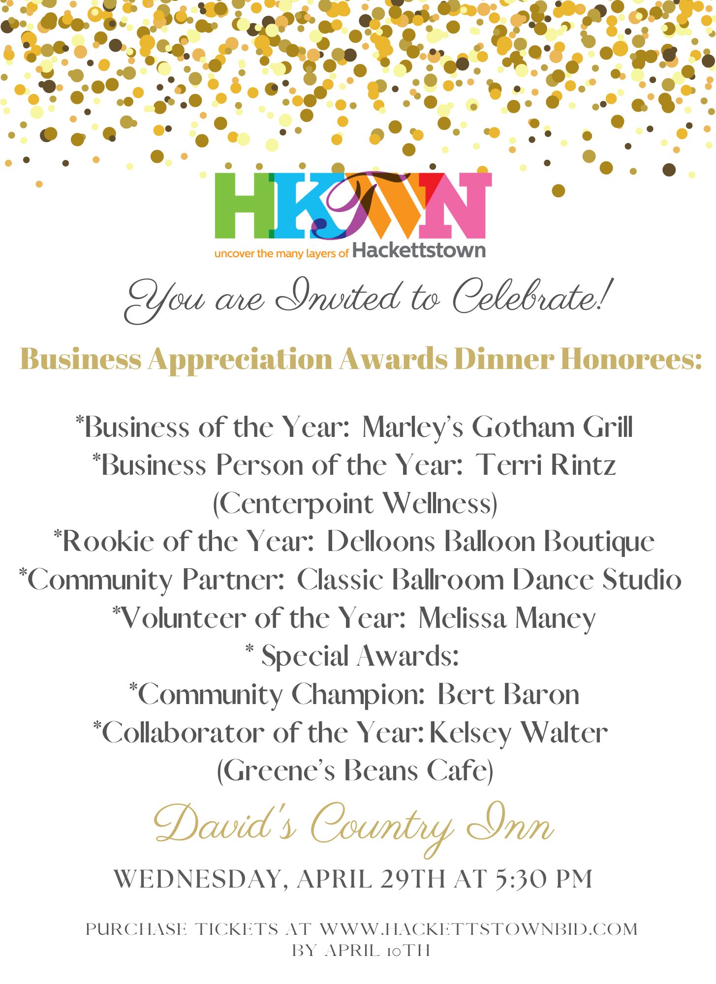 Join us to celebrate the Business Appreciation Awards Dinner Honorees at David’s Country Inn!