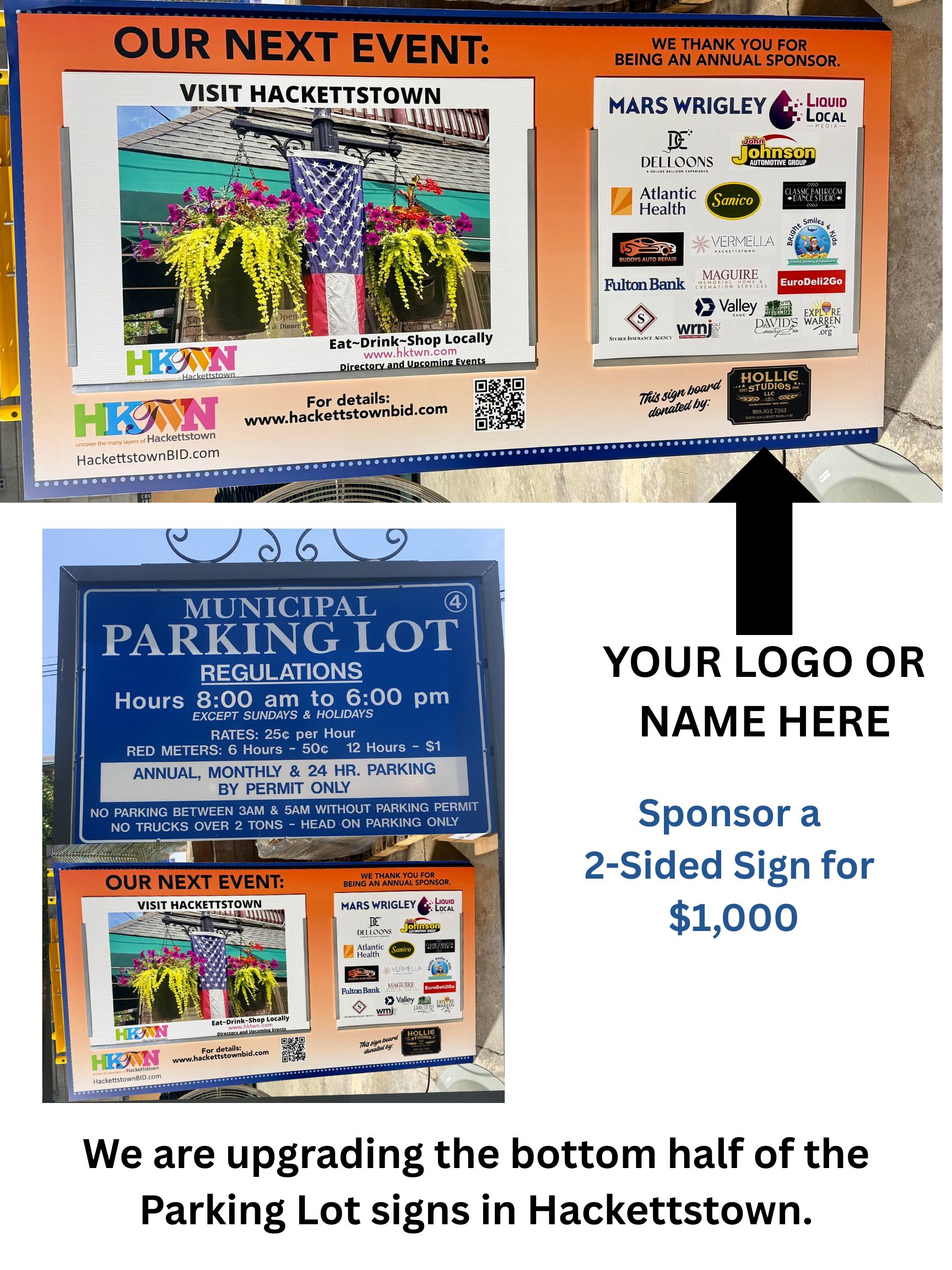 We are upgrading the bottom halves of seven Municipal Parking Lot Signs in Hackettstown, aiming to not only beautify our town but also to recognize our annual sponsors by displaying their logos prominently on the right side of the signs. Additionally, we will refresh event signs on the left side.